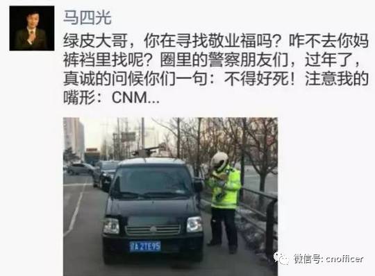 “绿皮大哥,你在寻找敬业福吗?咋不去你.妈.裤.裆里去找呢?圈里的警察们,过年了,真诚的问候你们一句:不得好.死!注意我的嘴型CNM......”