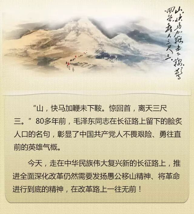 今天,走在中华民族伟大复兴新的长征路上,推进全面深化改革仍然需要发扬愚公移山精神、将革命进行到底的精神,在改革路上一往无前!
