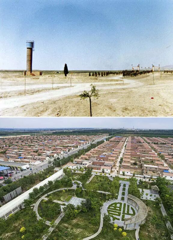 拼版照片:上图为宁夏永宁县闽宁镇建设初期的乡镇雏形(资料照片);下图为俯瞰宁夏永宁县闽宁镇原隆移民村(2016年7月22日摄)。新华社记者 王鹏 摄