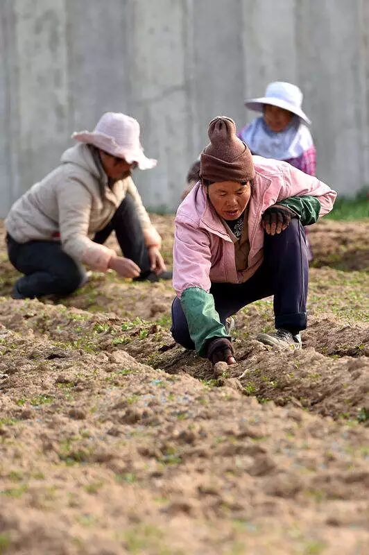 2016年3月23日,在河南省鹿邑县杨湖口镇小庙村,农户为蔬菜间苗。新华社记者李博 摄
