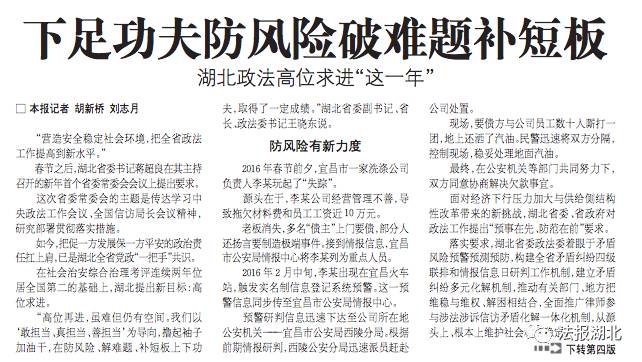 面对经济下行压力加大与供给侧结构性改革带来的新挑战,湖北省委、省政府对政法工作提出“预事在先、防范在前”要求。