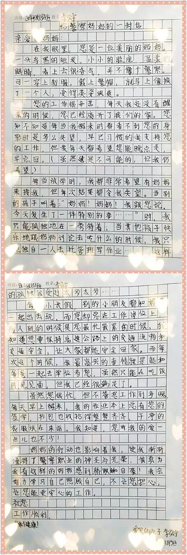 后天就是“女神节”了,懂事的小家伙特意写了一封信,送给他深爱着的警花妈妈