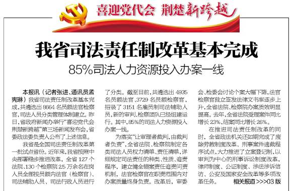 我省司法责任制改革基本完成,共遴选出8664名员额法官检察官,司法人员分类管理体制建立。5月16日,湖北省政府新闻办举行“喜迎党代会荆楚新跨越”第三场新闻发布会,省委政法委负责人公布了上述信息。